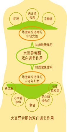 大豆异黄酮与雌激素的结构类似,它能与雌激素受体结合,表现弱雌激素和抗雌激素的双重活性。当体内雌激素分泌水平较高时显出抗雌激素特性,如对于雌激素分泌较多的年轻女性,大豆异黄酮可降低体内的雌激素水平,预防雌激素水平过高所引起的疾病;当体内雌激素分泌较少时显出弱雌激素特性,如对于更年期妇女,大豆异黄酮可提升体内的雌激素水平,预防与雌激素消退有关的疾病,如高血脂、动脉硬化、骨质疏松和更年期综合症等。